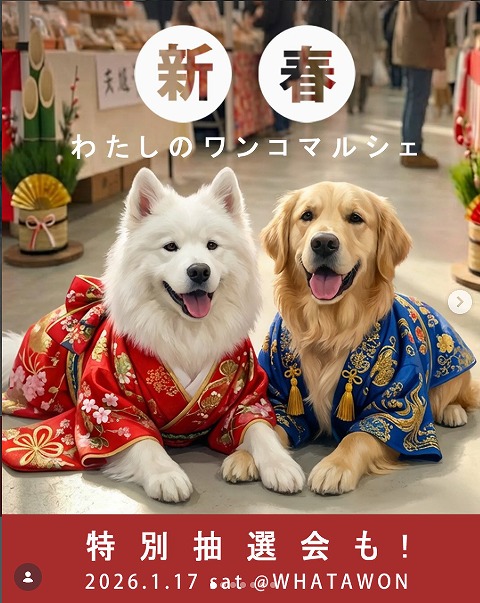 | ★見どころ★ | ワンちゃんも、飼い主さんも笑顔になれる新春ワンコマルシェを開催✨ 可愛いワンコグッズやおやつ、ハンドメイドアイテムが大集合🐾 さらに…お買い物すると参加できる『特別抽選会』も実施します🎁 |