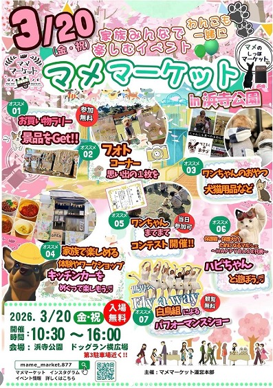 | ★見どころ★ | わんちゃんとオーナーが一緒に楽しめる「手づくり」に特化したマーケットです! 今回は日曜日のみの開催です。 お楽しみに。 |